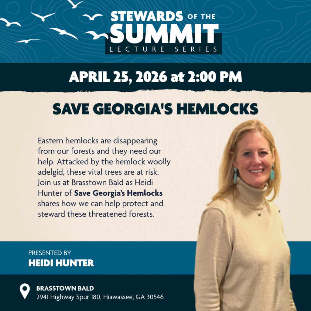 About the speaker and organization: Heidi Hunter is the Executive Director of Save Georgia’s Hemlocks, a 501(c)(3) nonprofit, which is a rapidly growing grassroots organization of energetic individuals with diverse backgrounds, interests, ages, and origins, united by a common purpose to save the hemlocks. SGH is characterized by a proactive approach to caring for the environment, a culture of inquiry and independent thinking, appreciation of diversity, respect and transparency in all interactions, creativity and results-oriented hands-on engagement, conservative financial practices, and high ethical standards. For more information and to learn how you can get involved, please visit: Save Georgia’s Hemlocks. And of course, come see us in person at the bald!